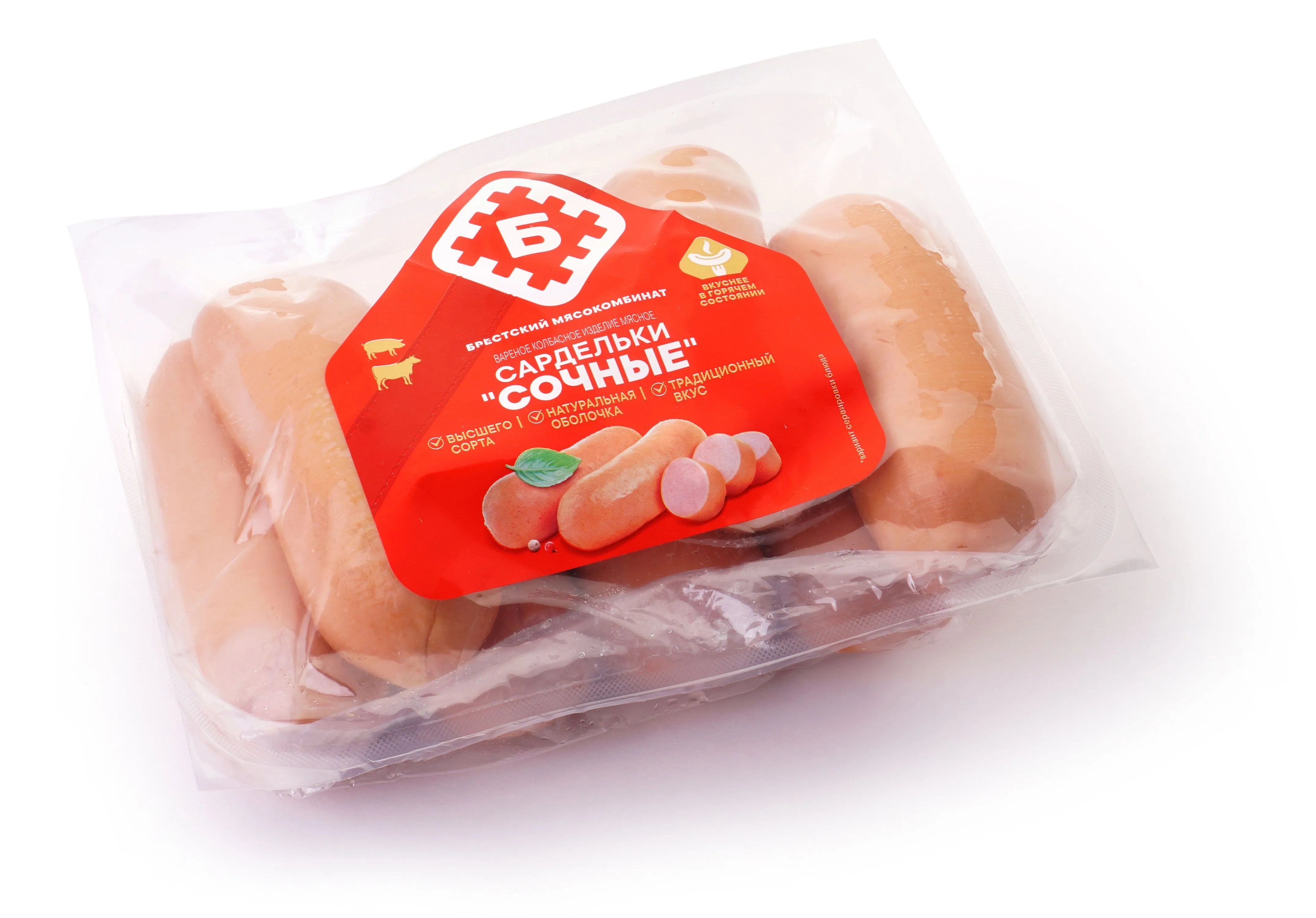 Сардельки "Сочные" м. уп. - настоящая находка для любителей вкусных и сытных мясных изделий. Белорусские сардельки изготавливаются из качественного натурального мяса по традиционным рецептам.
